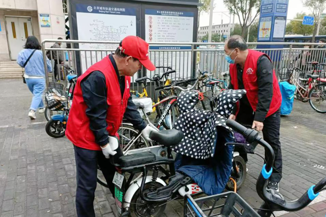 戴福成(左)将地铁站口的电动自行车摆放整齐。