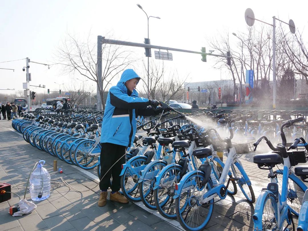 记者在共享单车停放区看到,运维人员正在清洗车辆,用高压水枪对车身进行整体冲洗后,认真擦拭每辆车的车把、车身、车座等部位。“除了清洗车身,还要对车链、车闸等重点零件进行检修。每天我需要清洗、维护500余辆共享单车,确保市民可以安全、舒适、便捷地使用车辆。”运维人员王晓东说道。