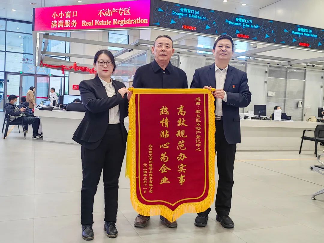 区不动产登记中心周到、高效的审批服务获得了企业的认可。为此,北京理工华创电动车技术有限公司相关负责人为区不动产登记中心送来一面锦旗,表示感谢。