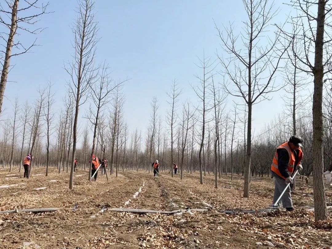 龙湾屯集体林场工作人员清扫林地落叶。