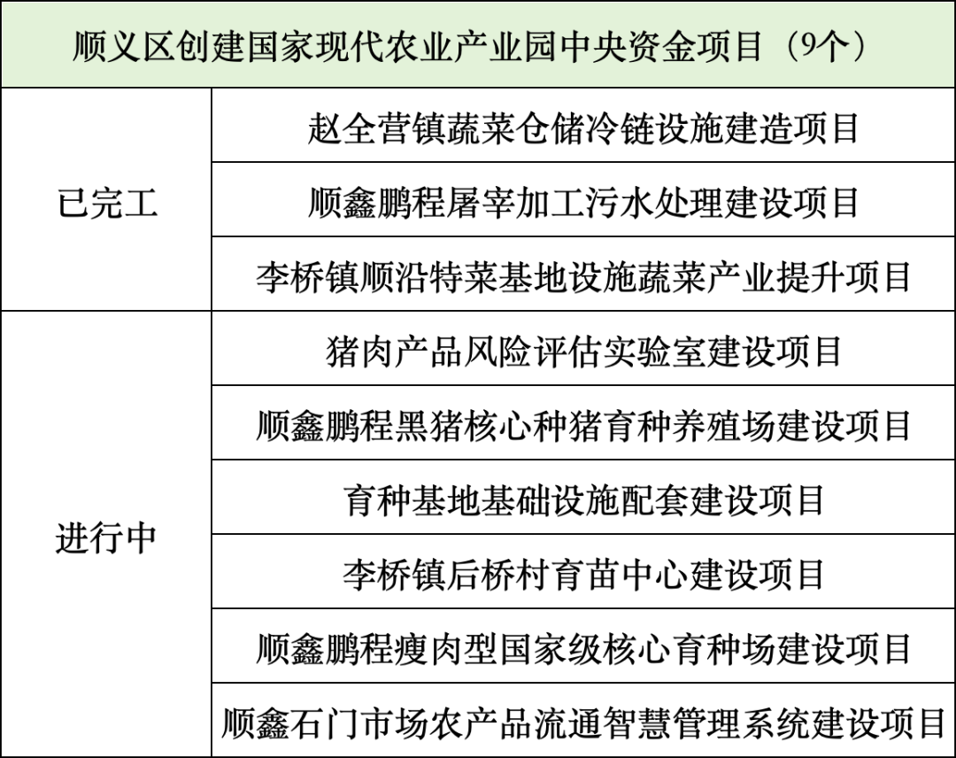2023年,顺义区以生猪(种业)和设施蔬菜为主导产业,成功入选国家现代农业产业园创建名单,并获中央奖励资金1亿元。产业园创建范围主要包含赵全营镇、李桥镇、南法信镇、仁和镇、高丽营镇、李遂镇、杨镇、北务镇、大孙各庄镇、龙湾屯镇,总面积达84.5万亩。