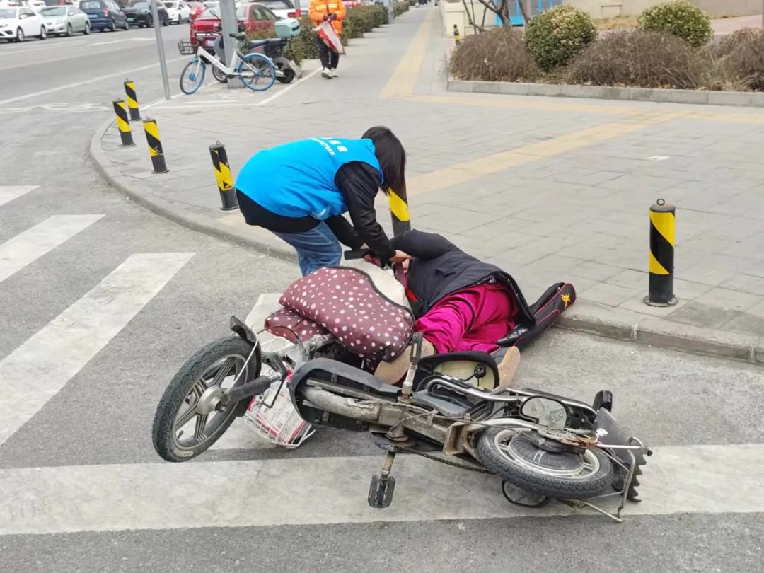 2月28日上午,澜西园四区居民刘井茹晨练后,骑着电动自行车回家。走到梅香街规划路十字路口时,她突然眼前一黑,失去了意识,连车带人摔倒在地,磕破了头。