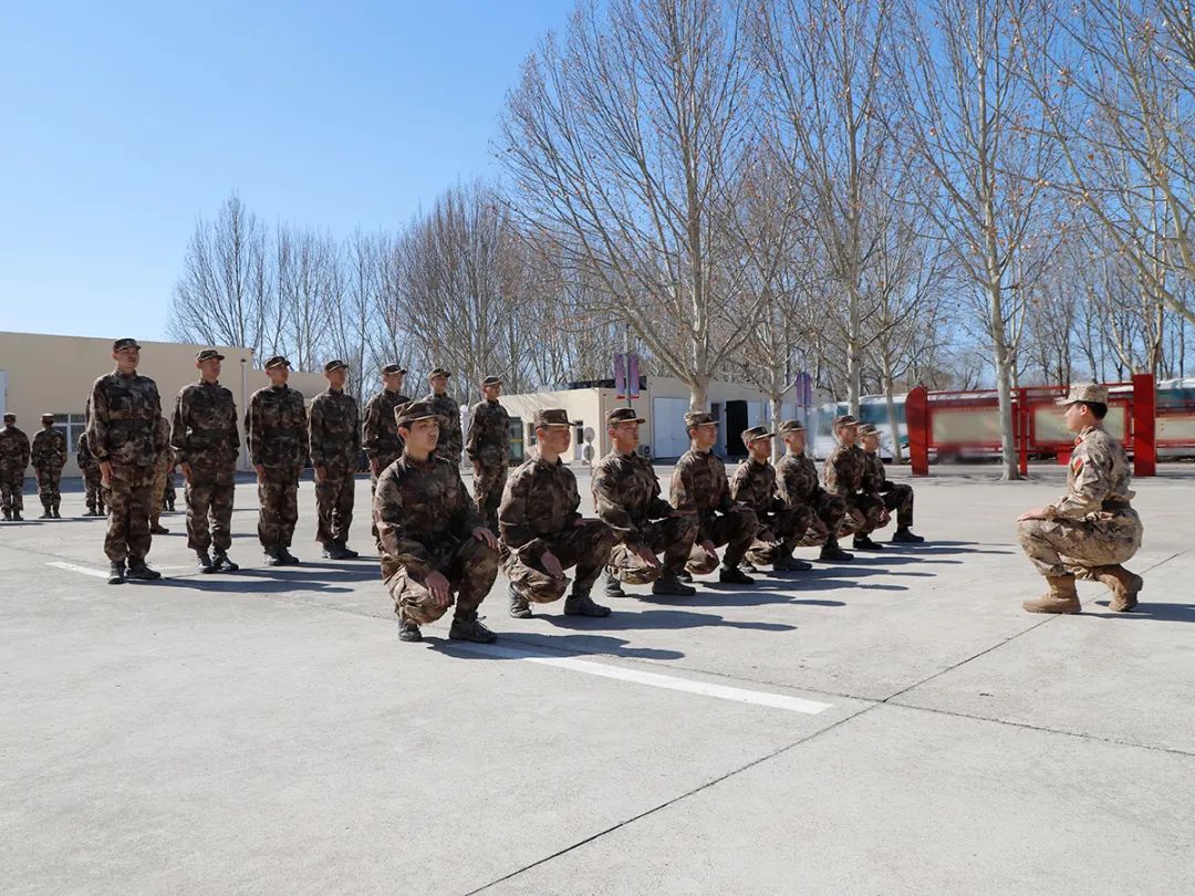 预定新兵进行蹲下起立、跨立训练。