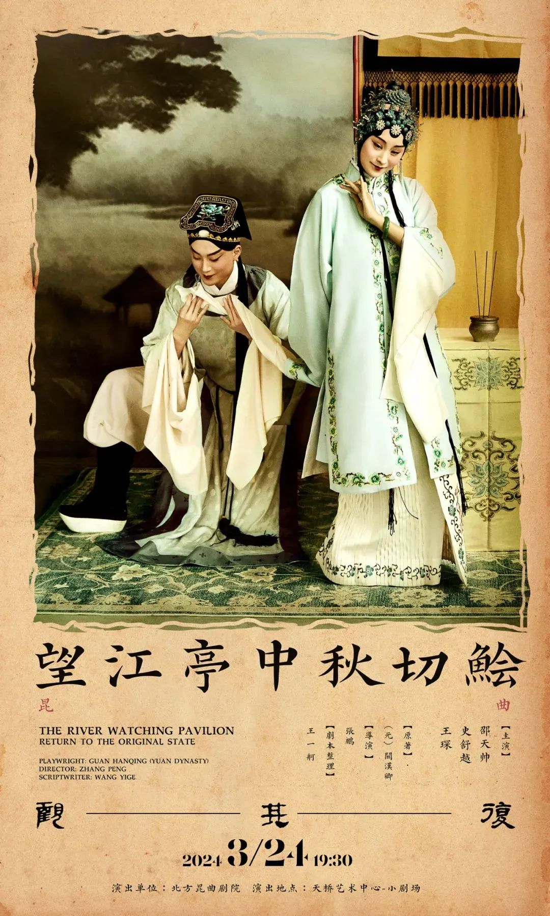 昆曲《望江亭中秋切鲙》是一部兼顾诗意抒情与生动情节,并且人物形象丰富的作品。它基于元代剧作家关汉卿《望江亭中秋切鲙旦》的基础上整理改编,这也是此题材首次以昆曲的形式进行演出。在全剧的音乐中,实验性复原了京高腔的片段加入其中,贯穿始终的主题旋律也是由京高腔变奏而成,最大程度展现北方昆弋的风格气势。在基于元杂剧的基础上,展现其本身蕴含的超越时代的艺术魅力。