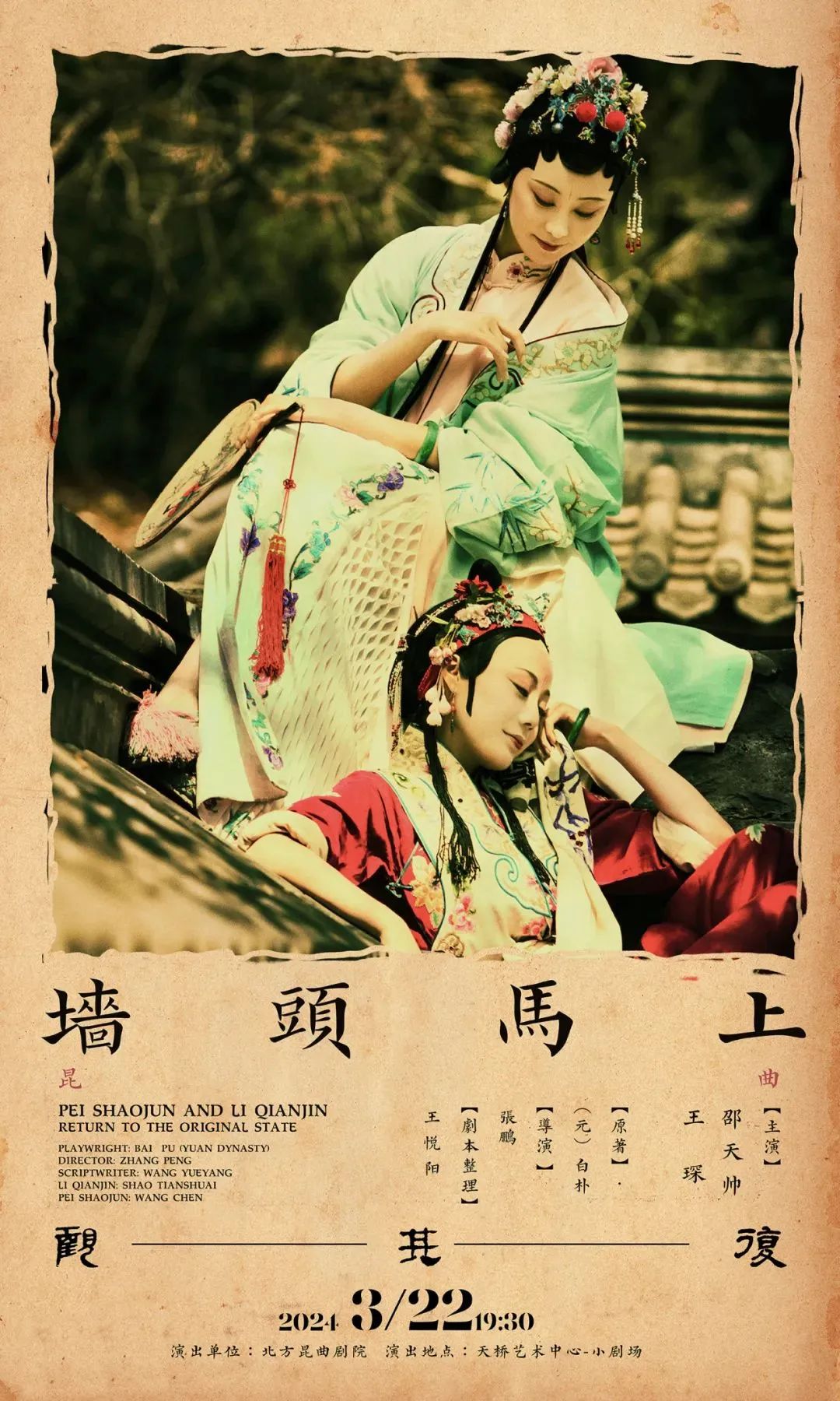 3月22日至24日,北方昆曲剧院的《墙头马上》《望江亭中秋切鲙》将在天桥艺术中心·小剧场上演。