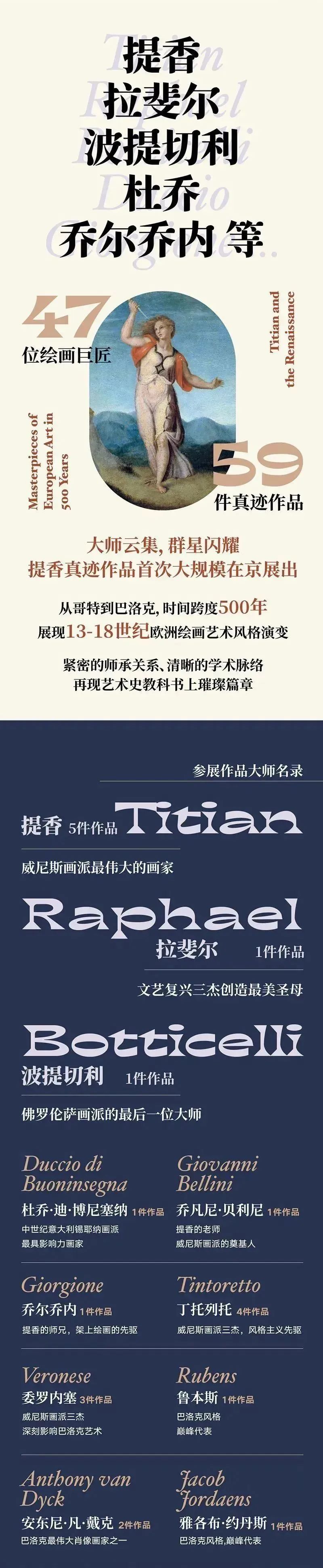 本次展览将展出来自乔塞佩·阿莱桑德拉收藏的提香、拉斐尔、波提切利、凡·代克、鲁本斯等47位欧洲绘画大师的近59件真迹。展现13世纪哥特艺术至18世纪的欧洲绘画风格,以色彩和线条奏响文艺复兴的优美旋律,呈现文艺复兴时期意大利绘画风格的发展变化和对17世纪至18世纪的欧洲画坛的影响。