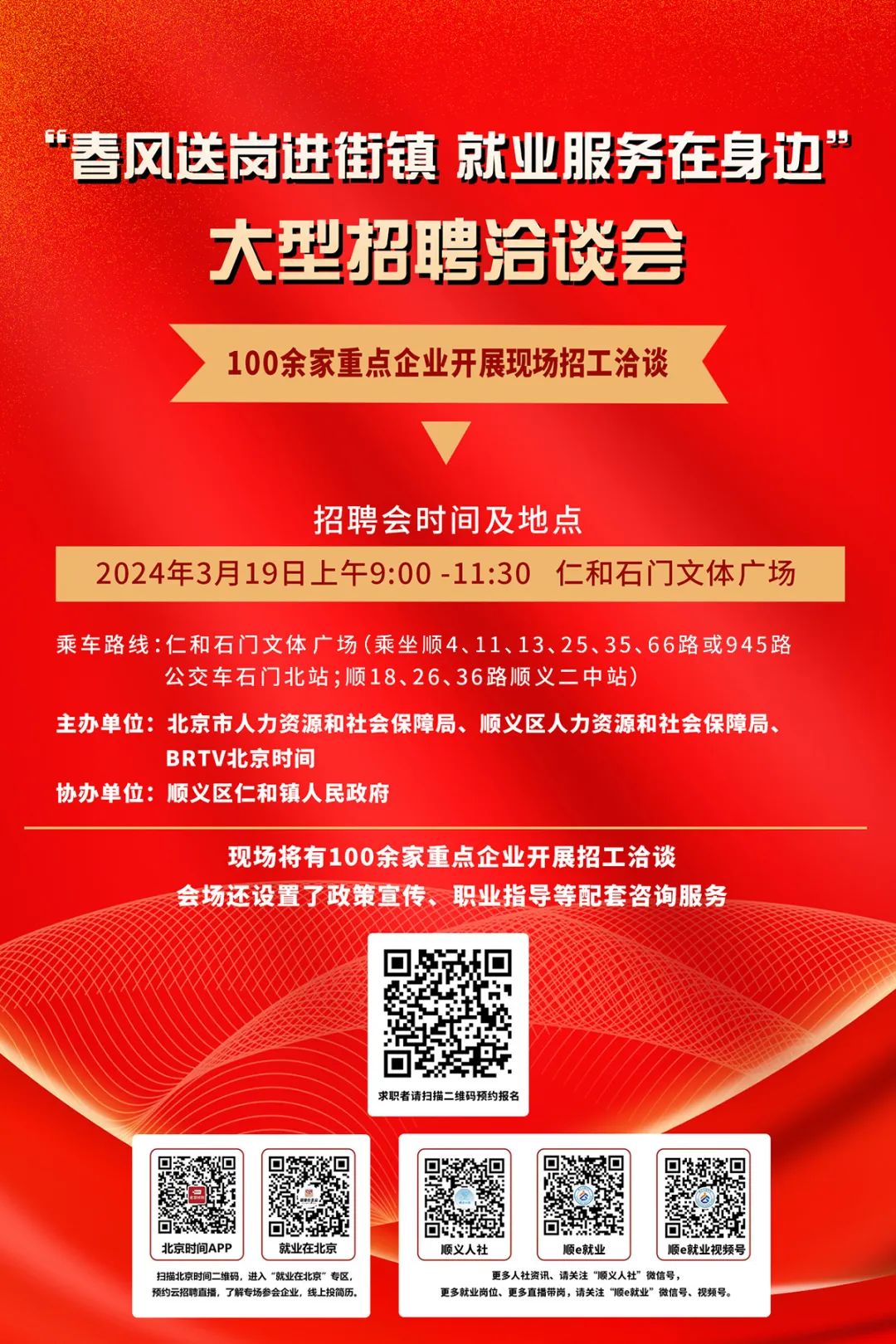 此次活动由北京市人力社保局、顺义区人力社保局、北京广播电视台北京时间主办,顺义区仁和镇人民政府协办,主要面向有就业创业意愿的农村劳动者、登记失业人员,特别是高校毕业生等青年群体、返乡返岗农民工以及有求职意愿的其他群体等。