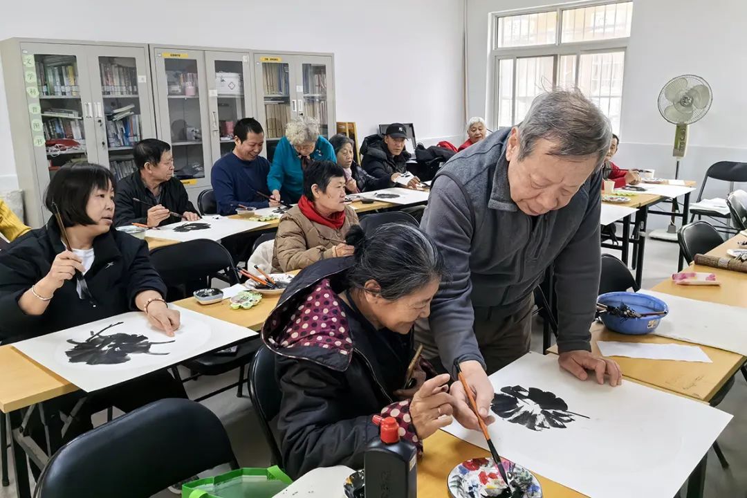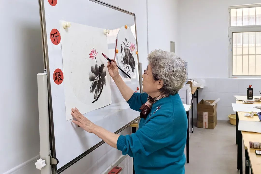 每次上课前,两人都会提前备课,熟记教课内容,提前到教室摆放好画具,为学员做好准备工作。课上,他们相互配合,一人在讲台上授课示范,一人在讲台下手把手指导学员。每次课程结束,一张张精美的画作在学员手中诞生,惊喜又自豪的笑容洋溢在他们的脸上。