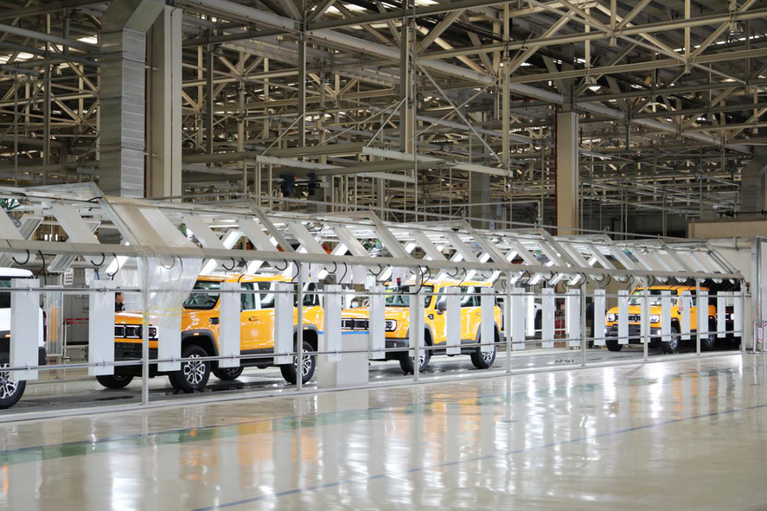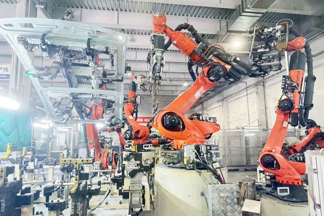 北京海纳川汽车底盘系统有限公司正在为北京奔驰生产天窗骨架。原材料进入工作区,9个机械臂分工合作,天窗骨架成品就做出来了。公司有2条天窗骨架生产线供应北京奔驰,月产能约2万台。此外,企业还为北汽越野车BJ40、BJ60、BJ80三款车型生产底盘车架。