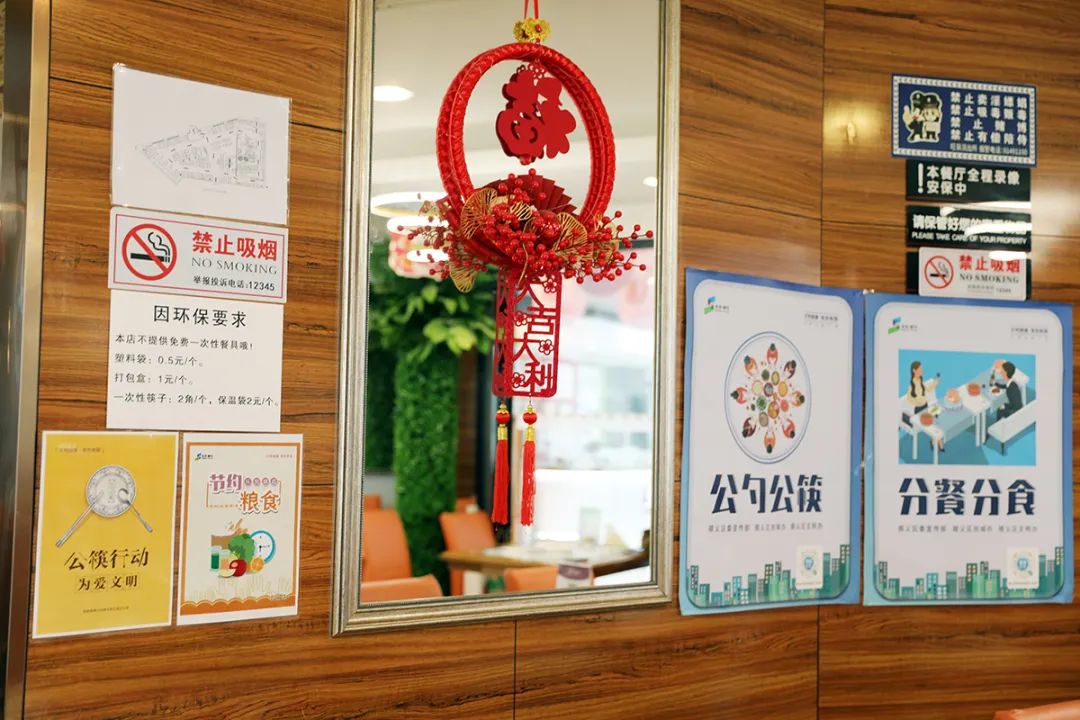 在隆华奥特莱斯内的餐饮店铺,“分餐分食”“节约粮食”等海报张贴在店铺的显著位置,工作人员按规范在每张餐桌上摆放公勺公筷,为市民提供安全舒心的就餐环境。