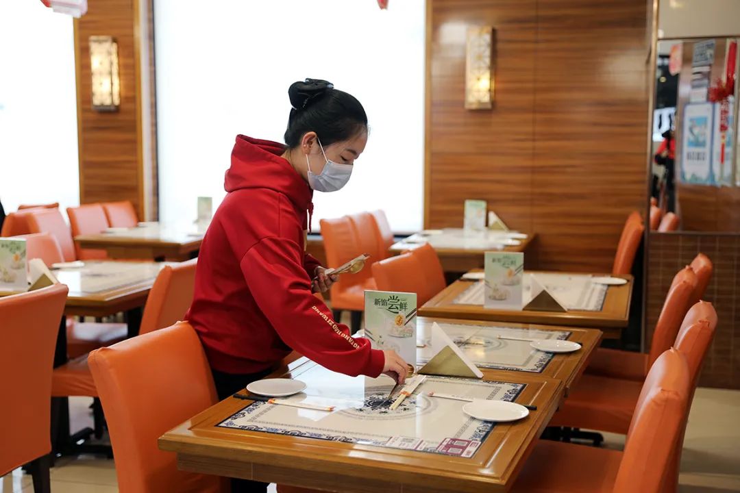 隆华奥特莱斯内餐饮店铺工作人员摆放公勺公筷。
