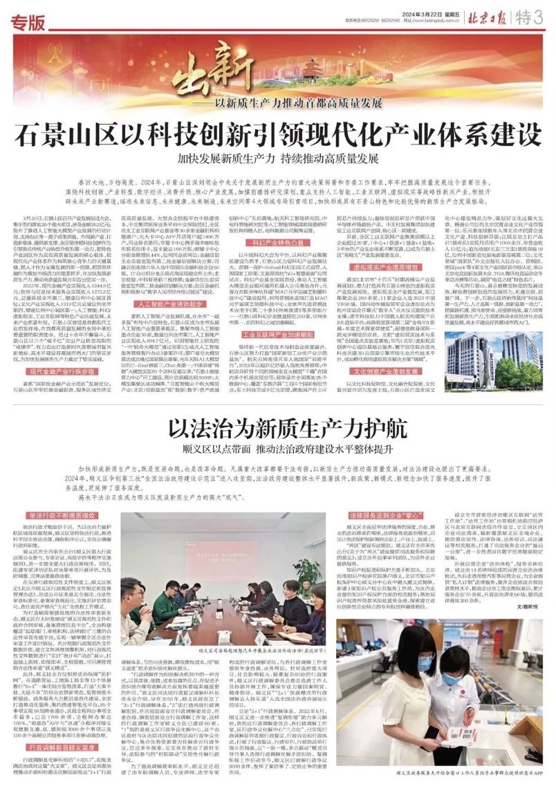 今天(3月22日)出版的《北京日报》特3版,专版刊发《以法治为新质生产力护航 顺义区以点带面 推动法治政府建设水平整体提升》。全文如下: