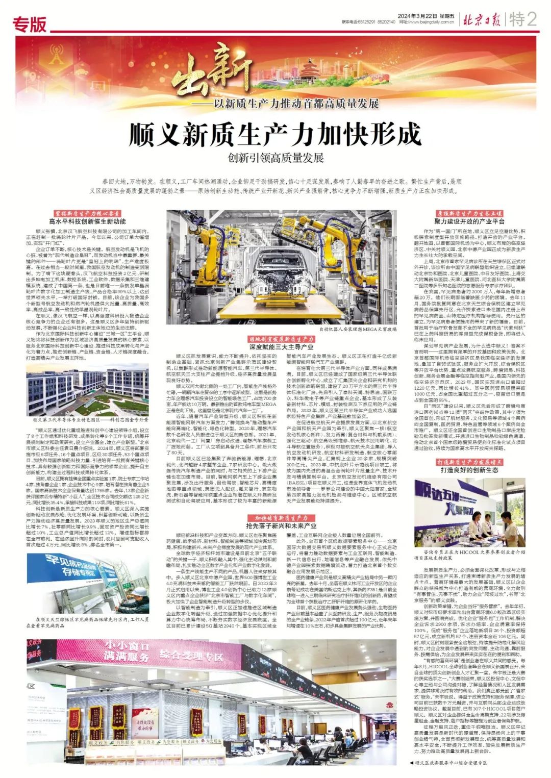 今天(3月22日)出版的《北京日报》特2版,专版刊发《顺义新质生产力加快形成 创新引领高质量发展》。全文如下: