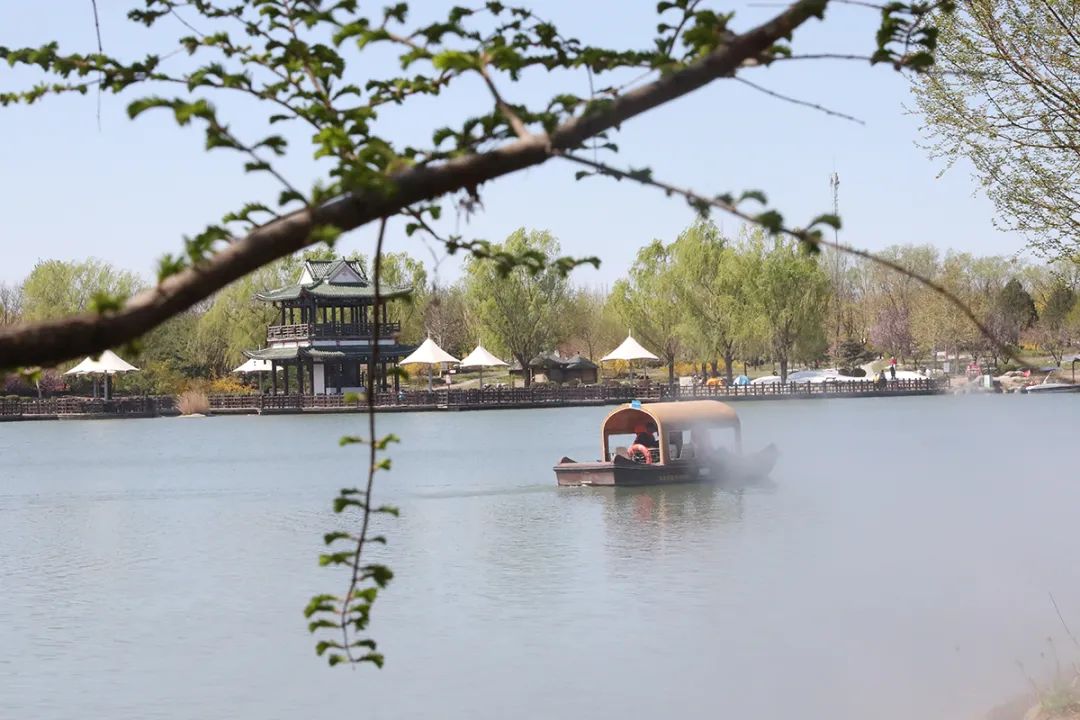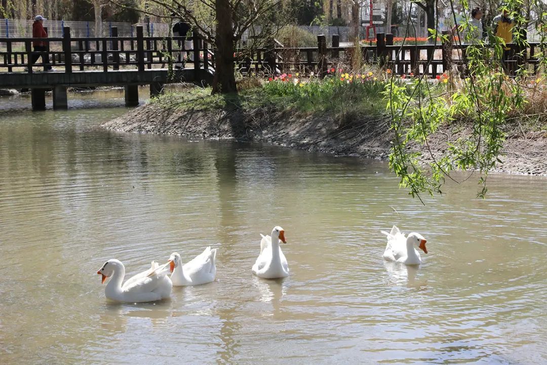 进入减河公园,便可以欣赏潮白河的壮美景观,波光粼粼的河面泛着点点微光,还有野鸭、水鸟前来觅食。公园里设有篮球场、塑胶跑道、健身器材等,不仅是老少皆宜的生态公园,也是春季赏花观景的好去处。