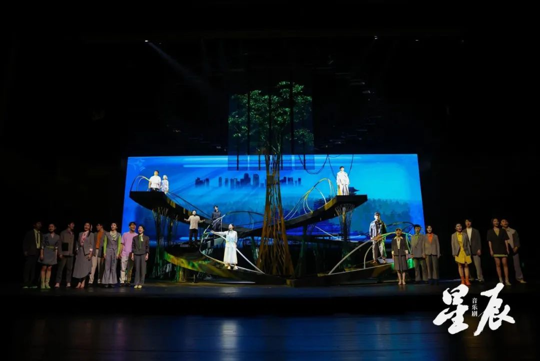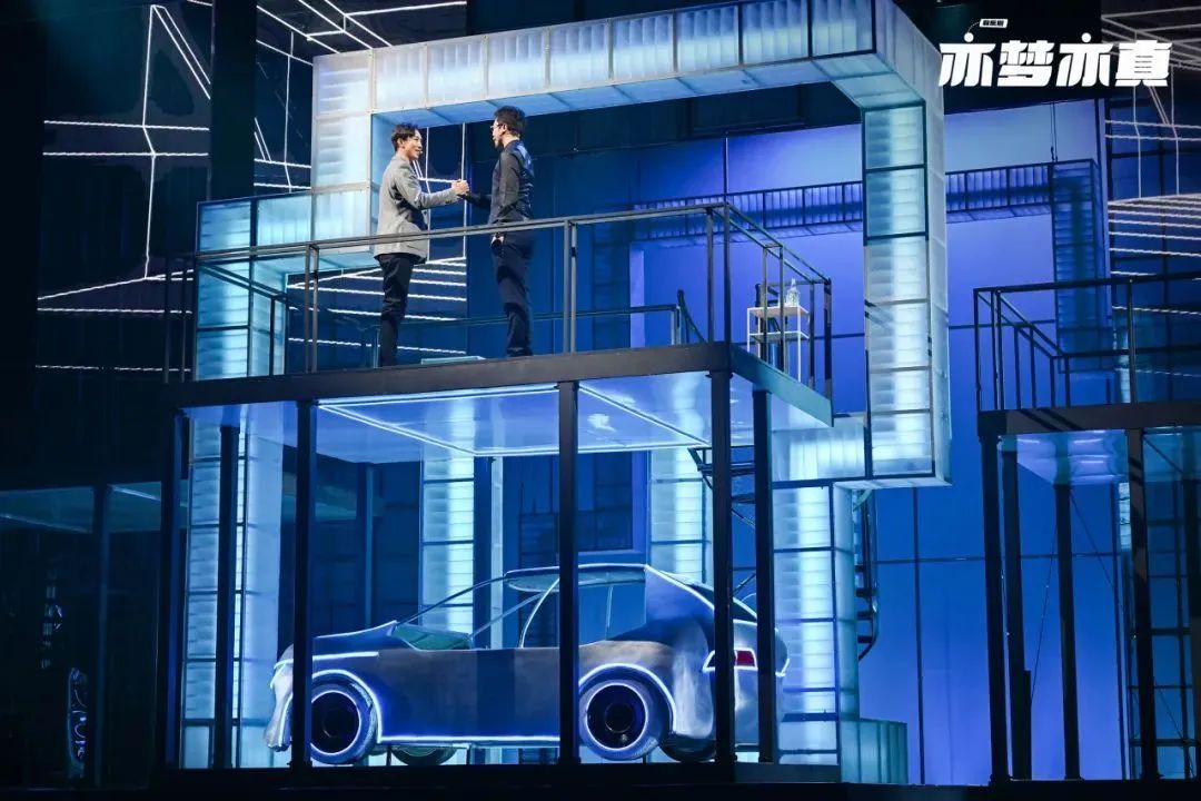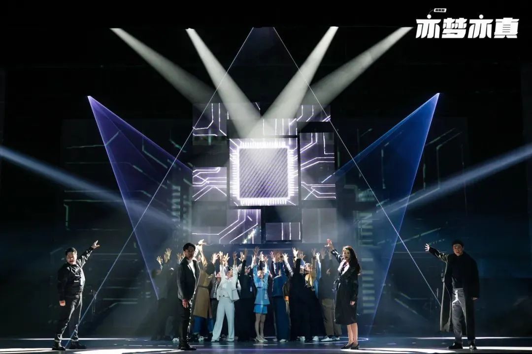 舞台空间中对冰屏、3d mapping投影、全息纱、全彩激光灯等新技术的充分运用,配合多座可动式“百变盒子”,在舞台上呈现出一座“科技感”“现代感”“时尚感”十足的“未来之城”。在音乐创作上,剧目作曲通过采样北京经济技术开发区中各大科技企业生产线上及生活区街道中真实的声音元素进行融合创作,在声音维度赋予了剧目令观众耳目一新的感受。