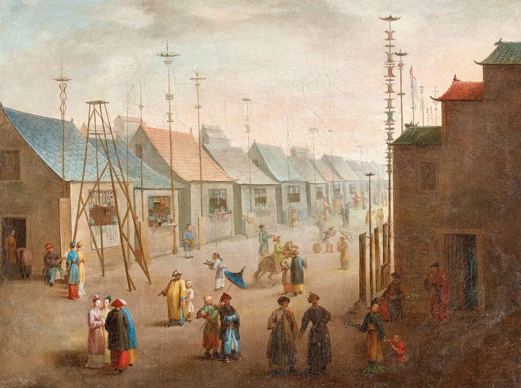 上:曾装饰凡尔赛宫“中国人厅”的油画《南京城集市》;