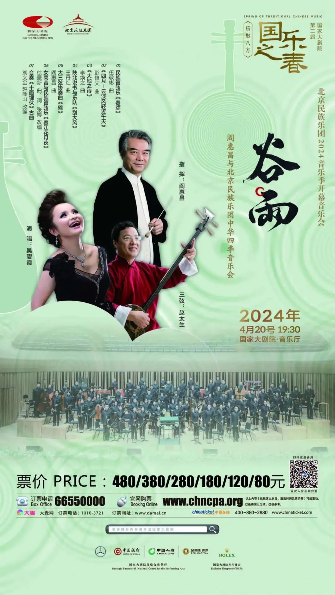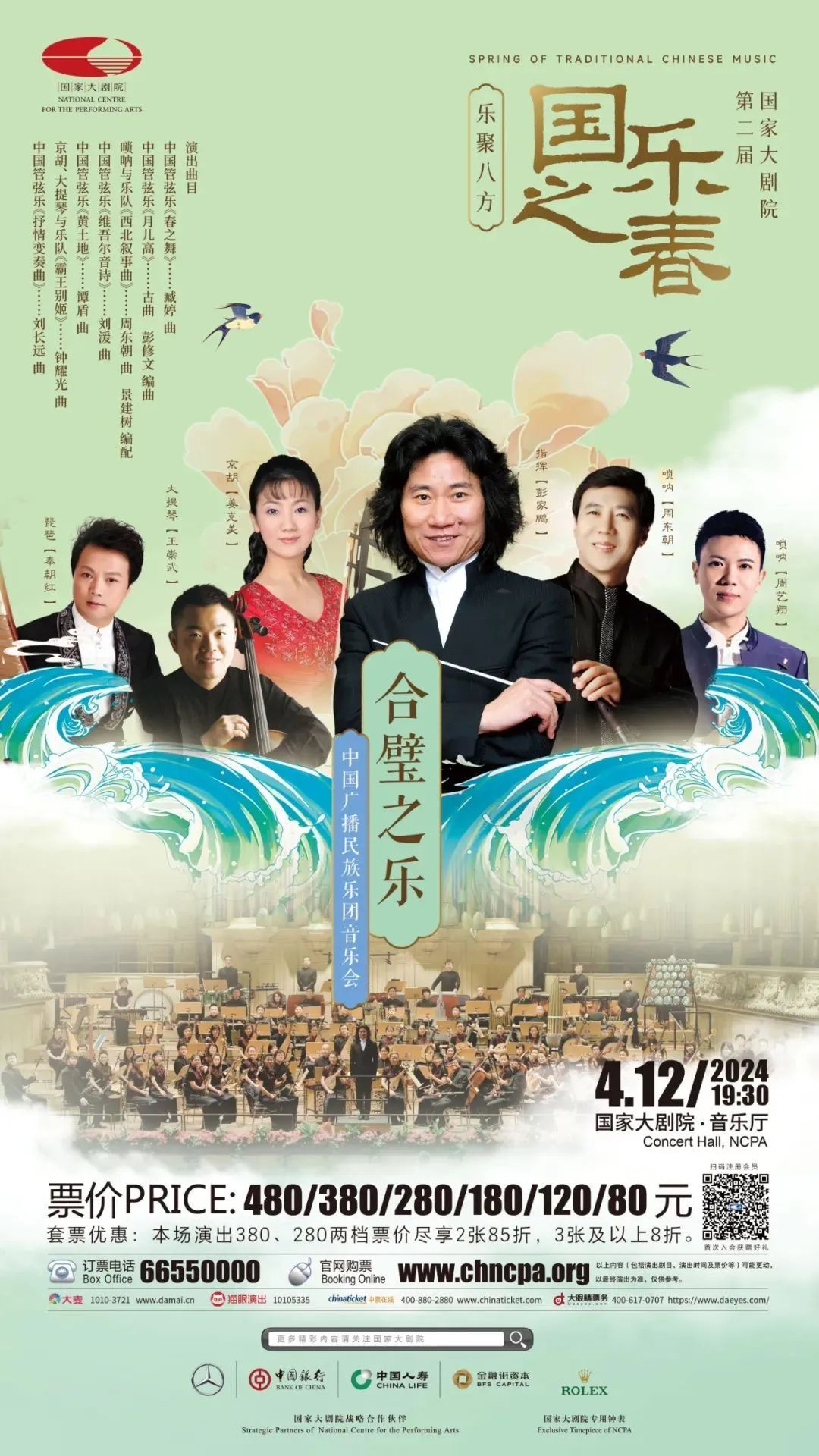 即将亮相乐聚八方-国家大剧院第二届“国乐之春”系列演出,同时为北京民族乐团2024音乐季开幕。特邀在国内外乐坛享有盛誉的著名指挥家阎惠昌执棒,中西合璧的“夜莺”吴碧霞担任演唱,香港中乐团三弦首席赵太生担任独奏,为观众带来高规格、高品质的国乐盛宴。