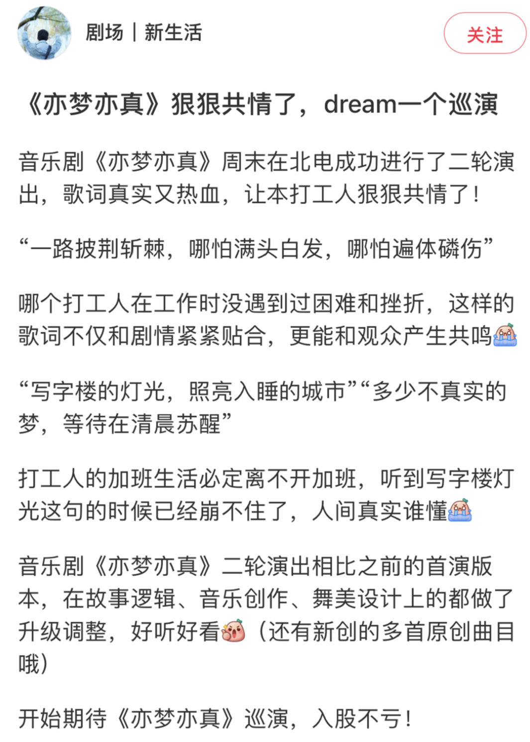 “《亦梦亦真》展现出音乐剧样式对于前沿领先科技产业题材的表现力,给观众带来智能网联体系、自动无人驾驶车等新体验,让科技前沿与艺术前沿展现出相互融合的魅力。该剧特别透过新生代主人公为了梦想成真而回国创业的故事,赞扬了北京人在建设新时代新北京过程中发挥的创造性作用。剧目在音乐、舞蹈和戏剧三元素的融合中富有力度地凸显出上述题旨。”