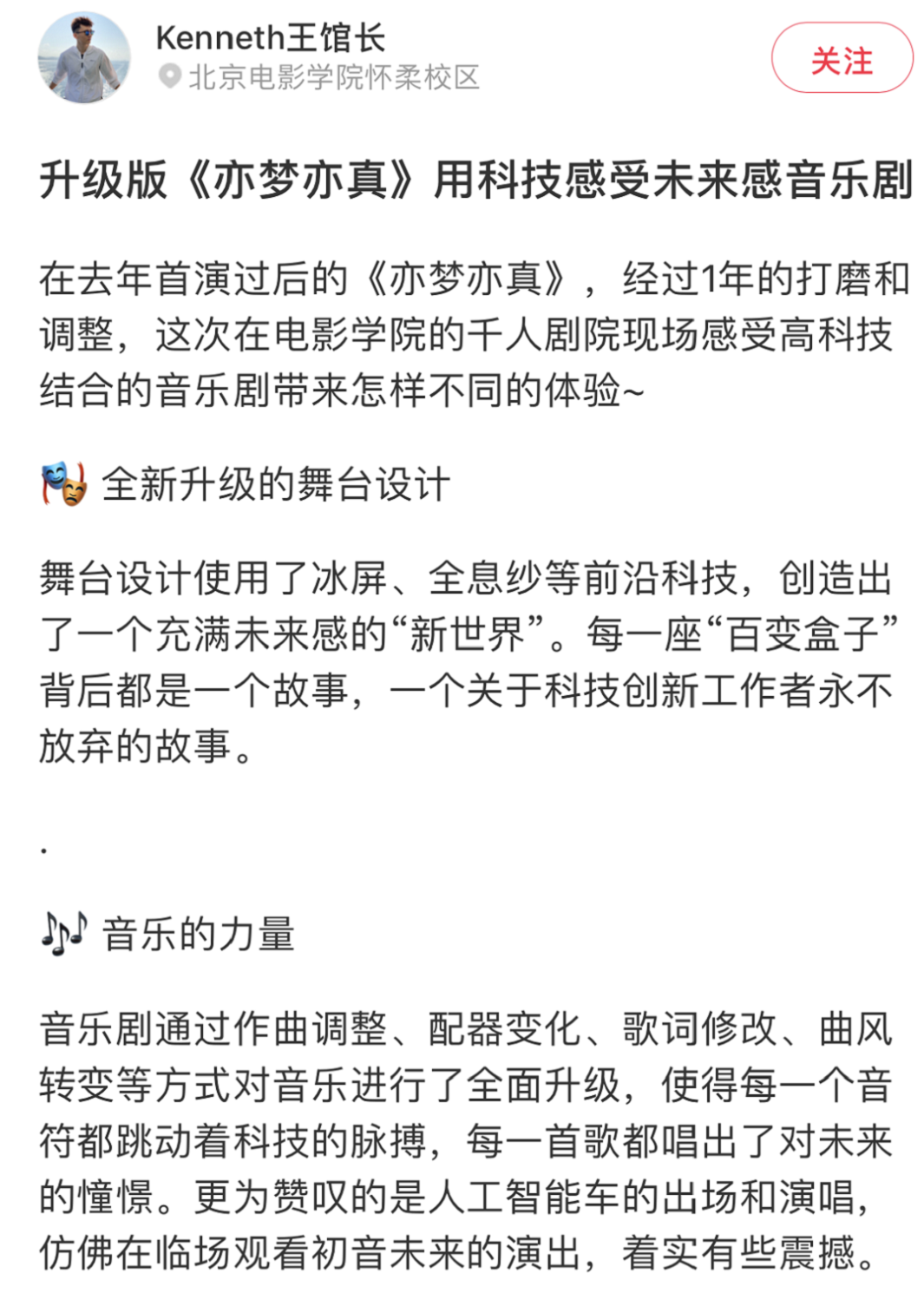 “《亦梦亦真》超出了我的预期。科技题材对于文艺创作而言存在一定难度,其元素、内容都不太适合以常规思维入戏。但《亦梦亦真》却能够与观众产生心理共鸣,而且还是以受年轻人欢迎的音乐剧的方式来呈现,这对文艺创作具有一定的导向性、实验性。尤其是《亦梦亦真》还会让更多观众对北京经开区,尤其是生活、工作在这里青年人的状态有一定的了解。”