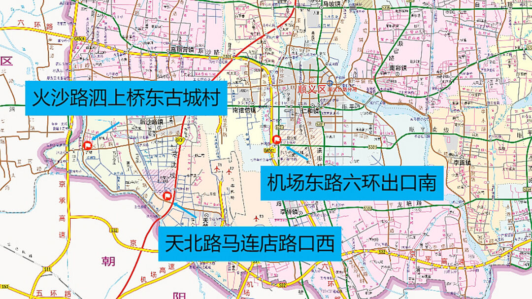 预测假期内,日均交通量较大点位为机场东路六环出口南、天北路马连店路口西、火沙路泗上桥东古城村。假日期间均有不同程度短时拥堵,请市民尽量错峰出行。