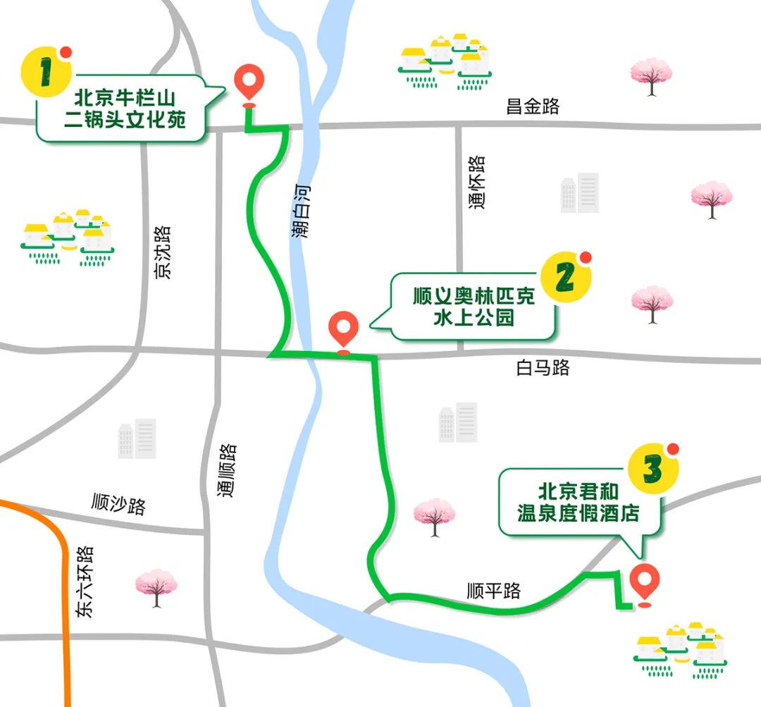 线路:顺义奥林匹克水上公园→北京国际鲜花港→汉石桥湿地公园→欧菲堡酒庄→北京焦庄户地道战遗址纪念馆