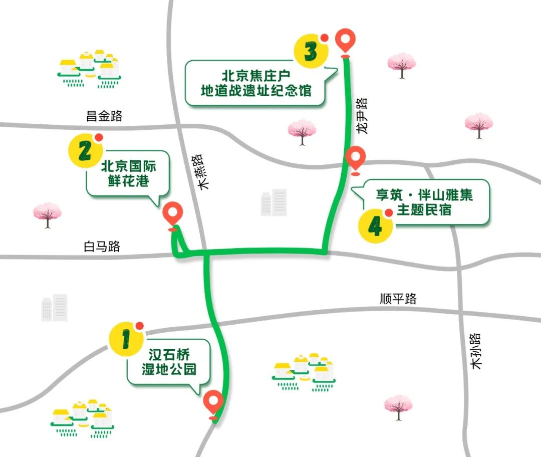 线路:汉石桥湿地公园→北京国际鲜花港→北京焦庄户地道战遗址纪念馆→享筑·伴山雅集主题民宿