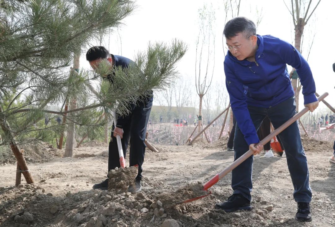 京郊大地,春意正浓。在位于北京温榆河公园顺义二期工程蓄滞洪区双子亭以南区域的植树现场,大家一起挥锹铲土、培土围堰、提水浇灌,一派热火朝天的劳动景象,气氛热烈。此次植树区域内平均高程30米,对京承高速以东地区具有百年一遇不受洪水侵害的防护作用。经过一个多小时的辛勤劳动,油松、栾树、国槐、紫丁香等乔、灌木共23种1200余株苗木迎风挺立,焕发出勃勃生机。