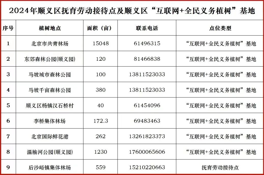 顺义区林木抚育活动接待点和“互联网+全民义务植树”基地信息。