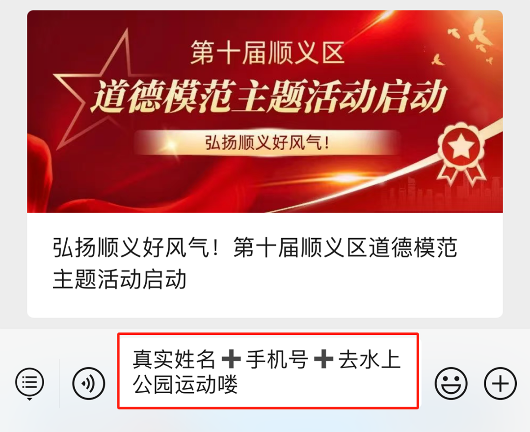 发送“真实姓名+手机号+去水上公园运动喽”至“北京顺义”微信公众号,即可参与活动。