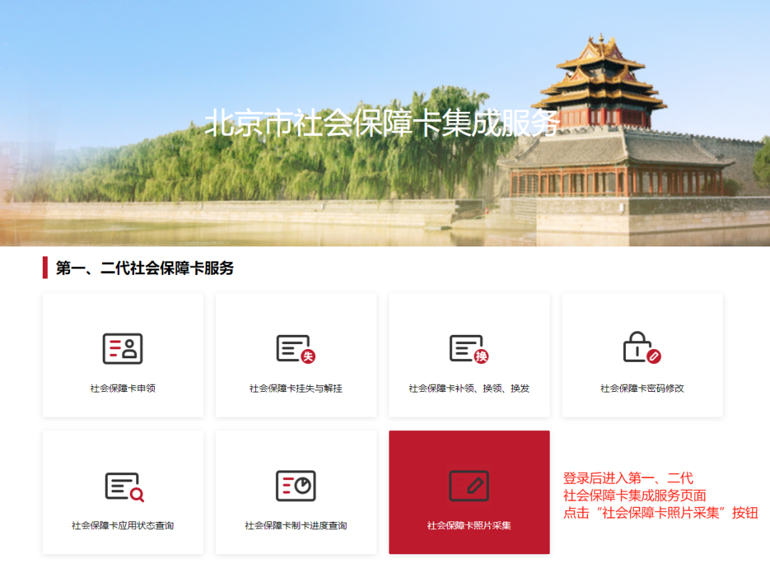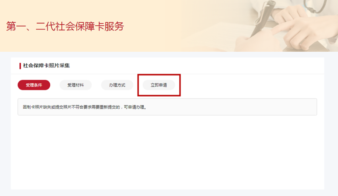 登录后,进入第一、二代社会保障卡服务页面,选择“社会保障卡照片采集”业务,点击“立即申请”。