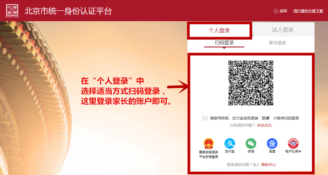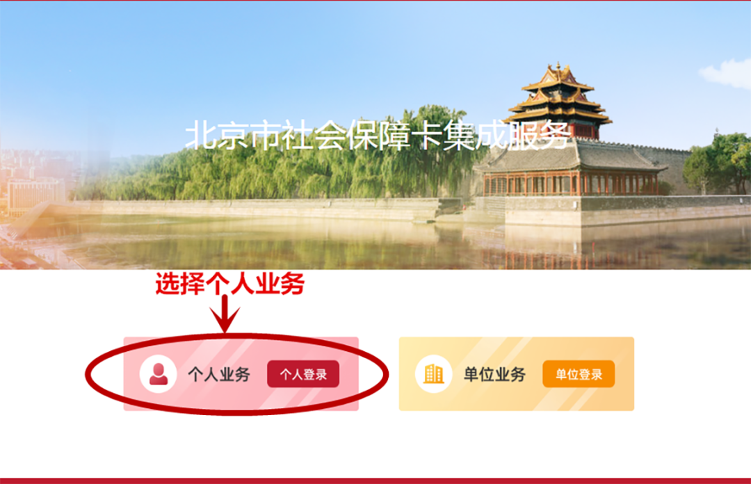 在北京市社会保障卡集成服务页面,点击“个人业务”。由于孩子本人没有账号,因此登录家长的账号即可,家长可以选择合适的方式登录。