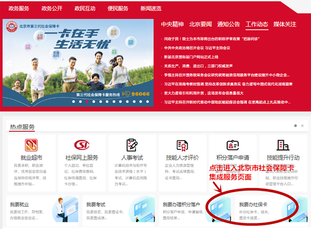 登录北京市人力资源和社会保障局官方网站(https://rsj.beijing.gov.cn/)首页,在“热点服务”栏目点击“我要办社保卡”进入北京市社会保障卡集成服务页面。