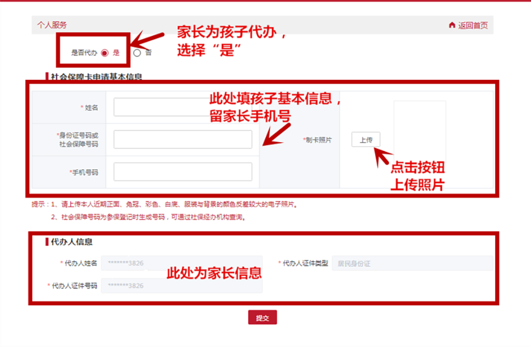 进入照片上传页面,家长在“是否代办”处一定要选择“是”,填好孩子的姓名、身份证号或社会保障号、联系人电话等相关信息,然后上传照片,最后点击“提交”就可以了。
