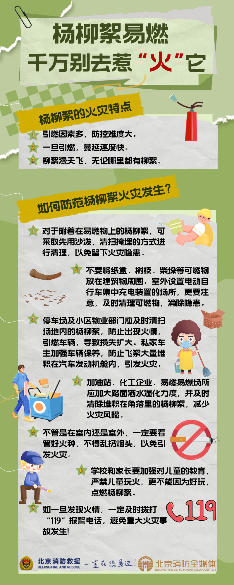 杨柳絮是杨树、柳树的种子,它包含大量油脂,遇到明火会引起燃烧,且蔓延速度非常快。每年的四五月,是柳絮飘飞的高峰期。