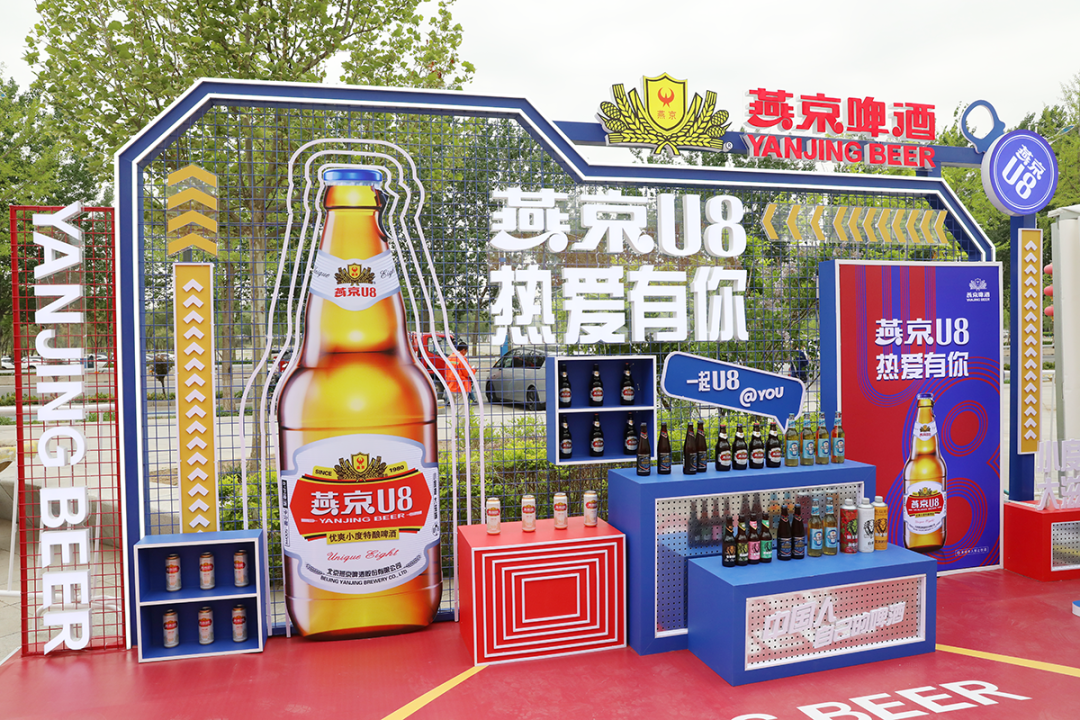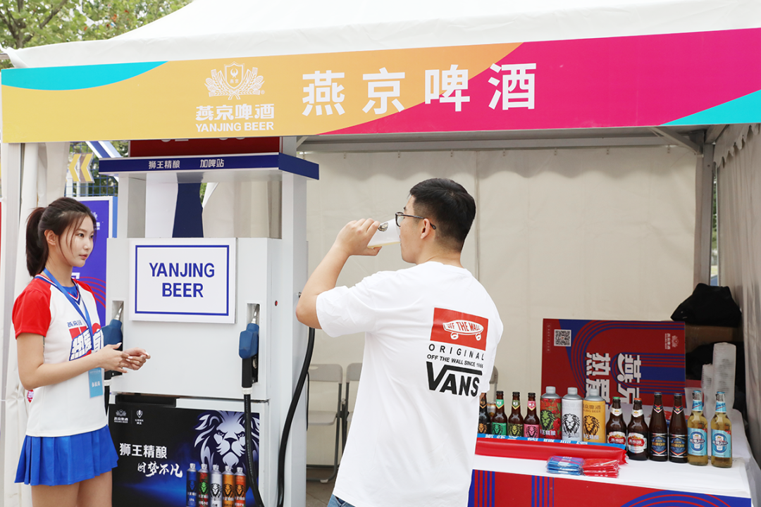 参赛者领物之余在燕京啤酒展位品尝啤酒。