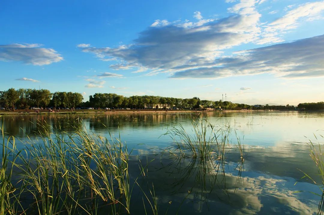 ②汉石桥湿地公园内水面清澈、空气清新,骑行于林木之间,看阳光照射下波光潋滟的水面,听鸟儿欢快地鸣叫,尽情感受回归自然的乐趣。