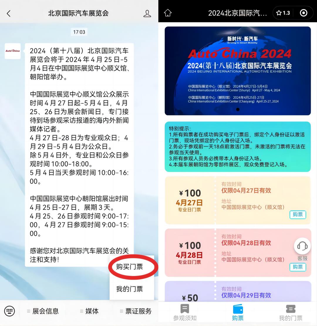 四、观众可通过微信公众号“北京国际汽车展览会”—“票证服务”—购买门票菜单登录“北京国际车展票务”小程序(点击此处跳转)及携程APP实名购买门票。车展主办方未授权其它机构和平台进行票务销售,请观众选择正确购票渠道,对在非官方渠道购买虚假参观票而引起的任何纠纷,车展主办方概不承担任何责任,并保留追究其相关责任的权利。