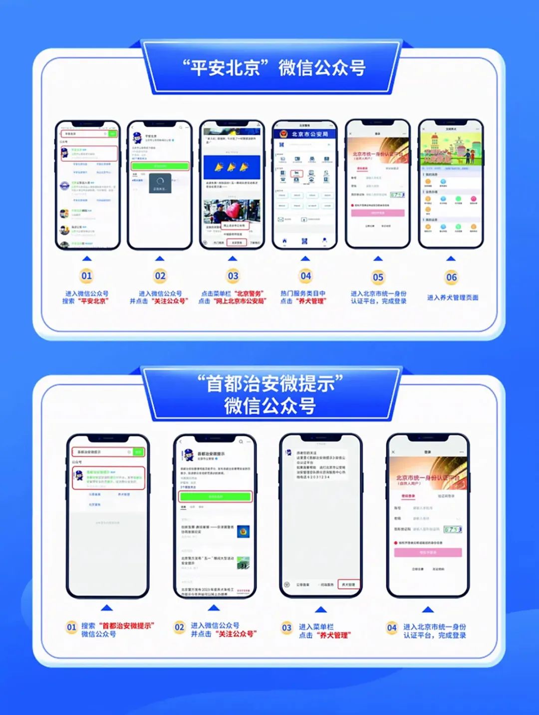 养犬人可通过“平安北京”微信公众号进入“北京警务——网上北京市公安局——养犬管理”界面,或通过“首都治安微提示”微信公众号进入“养犬管理”界面,用手机号登录系统,验证通过后即可进行相关业务办理,并可在线支付管理服务费。北京警方核实犬只符合养犬标准、证件正确无误后,即会为犬只办理相应手续,并形成电子犬证。用户可在“我的业务”栏目“我的犬只”中进行查看。