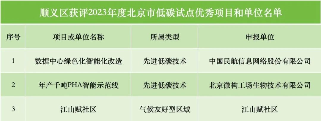 顺义区融媒体中心消息 近日,北京市生态环境局公布了2023年度北京市先进低碳技术、低碳领跑者、气候友好型区域三类低碳试点优秀项目和单位名单,顺义区2个项目、1个社区获评。