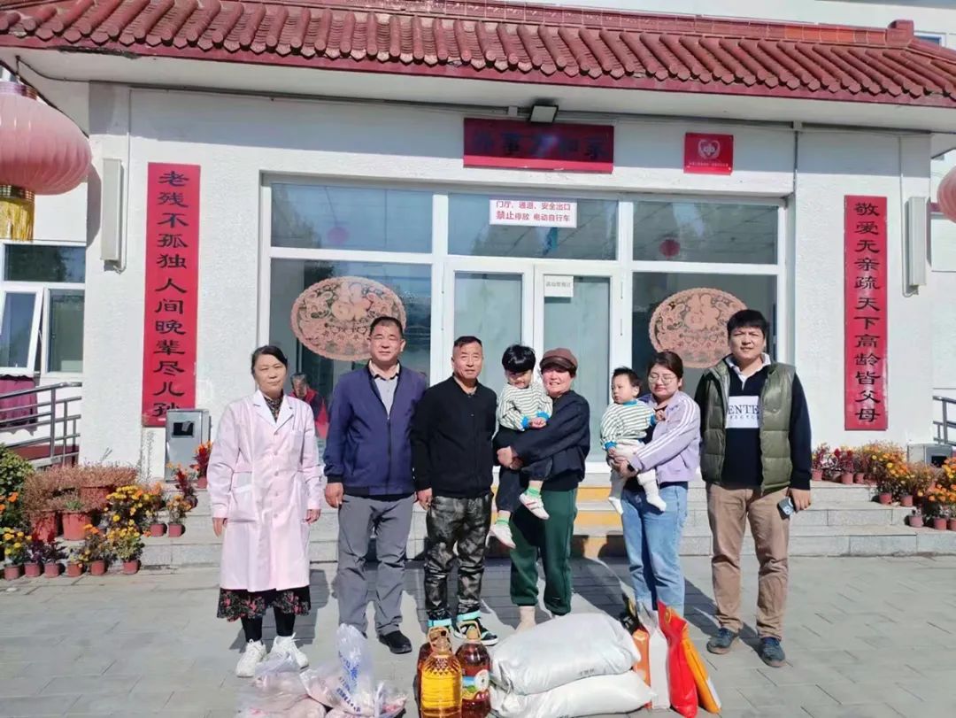 石广华(左三)与家人一起为敬老院送慰问品。
