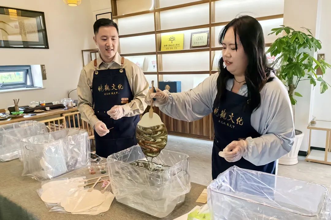 在“晴耕雨读”景区,游客在工作人员的指导下尝试制作漆扇,从中感受中华传统文化的魅力。“来逛公园还顺便体验了一把非遗漆扇制作,感觉跟传统文化有了直击心灵的交流,特别有成就感,而且收获满满。”游客张女士表示。