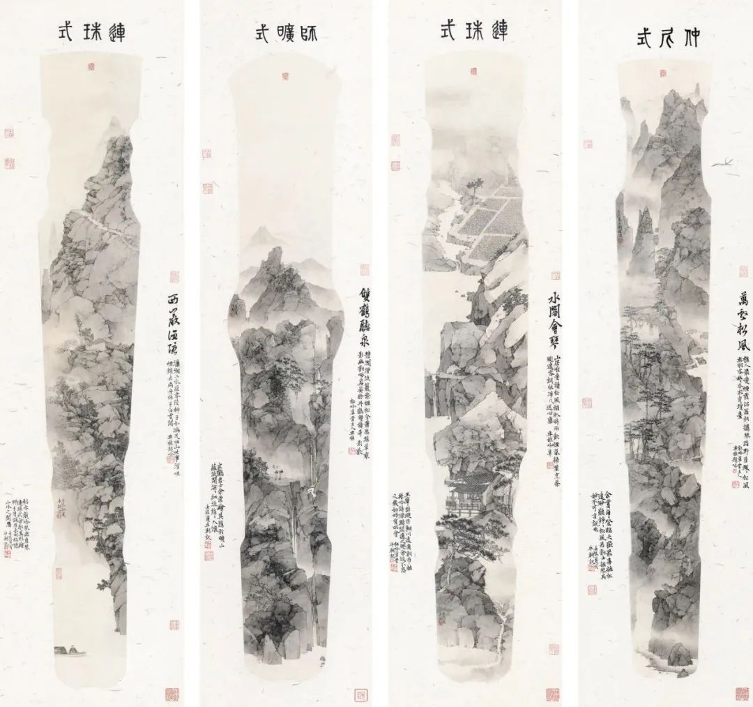 日常创作之余,牛朝通过钻研书法、诗歌、篆刻、古琴等中国古代文人雅士的爱好丰润自身山水画创作中的文人品格,这些爱好也为其增添了许多创作灵感。他将不同形制的古琴外形与山水画创作相结合,开创了山水“琴画”的先河,这些“琴画”构思精巧,笔线洗练,画面富有韵律与节奏,这不仅体现出牛朝对中国传统文化元素的独特见解与运用,也构成了画家强烈的个人风格。