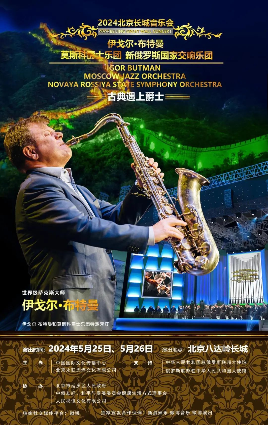 5月25日至26日,中国观众和爱乐者们将体验“古典遇上爵士”。伊戈尔·布特曼是世界著名的萨克斯演奏家,他率领的莫斯科爵士乐团与众多世界级爵士演奏家合作,被称为“艺术大师乐团”。这次长城音乐会,他不仅带来了他的全编制18人乐团,还联袂新俄罗斯国家交响乐团同台演出。他还将登上夜长城,演奏他改编的中国乐曲《龙的传人》和《灯火里的中国》。