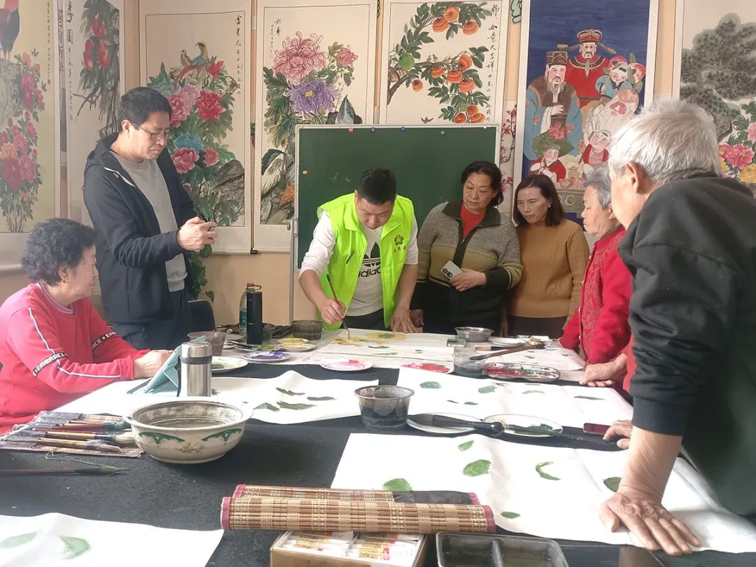 每周一上午,刘军都会到下西市村养老驿站为老年人义务教授国画。“这里的墨要重一些,衬托前面的物体;这里要勾勒出物体的轮廓……”课堂上,他手持毛笔耐心认真地向老人讲解国画落笔的轻重、用墨的深浅等基本要领,老人们在宣纸上练习、创作。“在这里学习的老人,基本没有绘画基础,我重点教他们基本技法,再让老人选择喜欢的风格进行创作。”刘军表示。