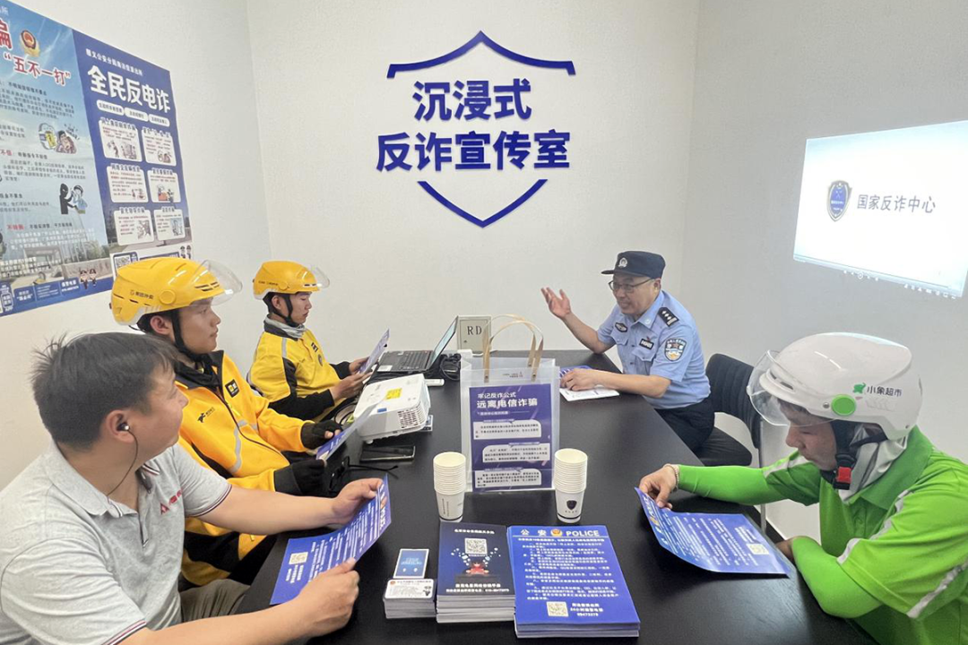 绿色出行体验中心是一个充换电实体体验店,也是外卖小哥的休息驿站。“警企联动反诈驿站”利用“请进来+走出去”的运营模式,采取沉浸式宣传、主题式宣讲等方式,向外卖骑手普及反诈知识,同时充分发挥外卖骑手“流动宣传员”的优势,组织外卖骑手在送餐过程中向群众发放反诈宣传手册,进一步扩大宣传覆盖面。