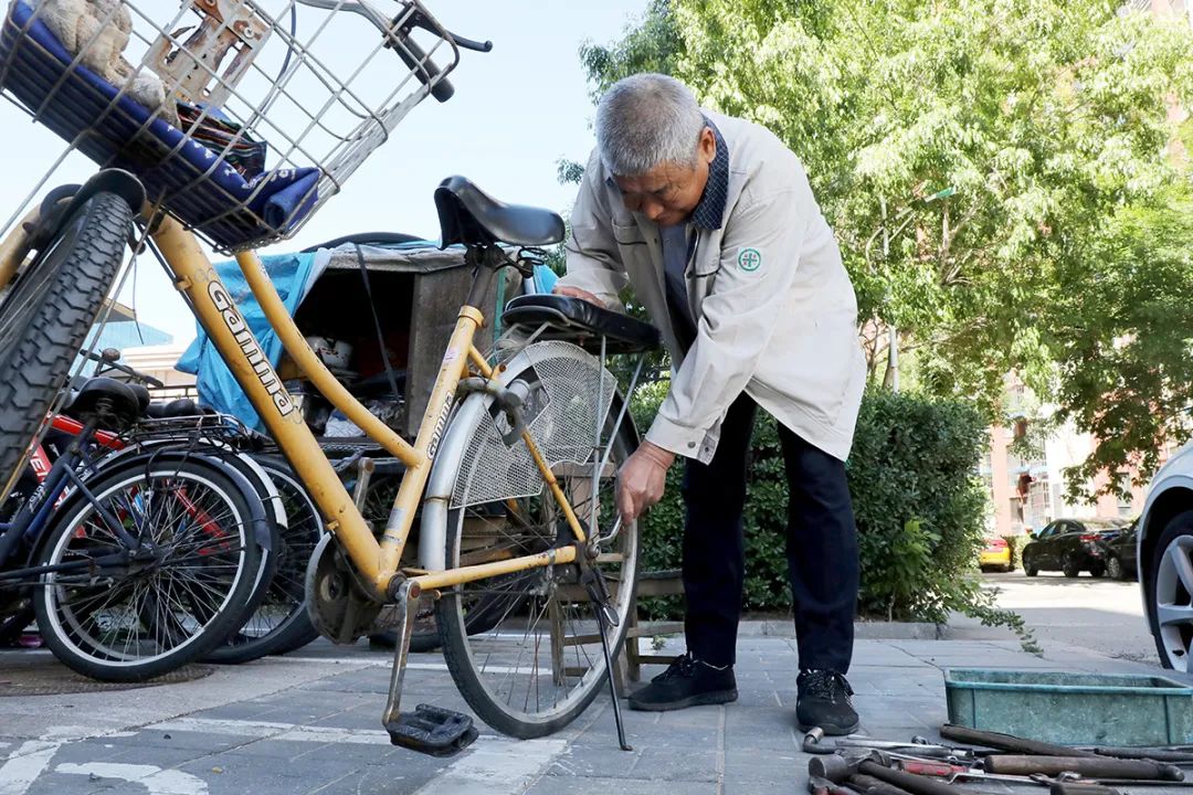记者看到田德凤的时候,他正准备为一辆自行车补胎。只见他把自行车翻了个个儿,车座朝下,放在地面上,用工具把车轱辘卸下来,扒开外胎,把内胎从里面拉出来,再把内胎压到水里仔细检查。查出哪里漏气后,他便开始修补起了车胎。不一会儿,车胎就补好了,居民李女士笑着说:“还得是田师傅的手艺,修的又好又快,谢谢您!”田德凤摆了摆手说:“没事没事。”