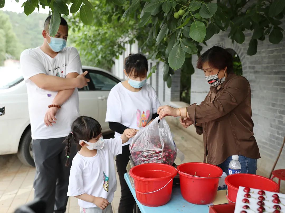 游客到樱桃采摘园采摘樱桃后称重付款。