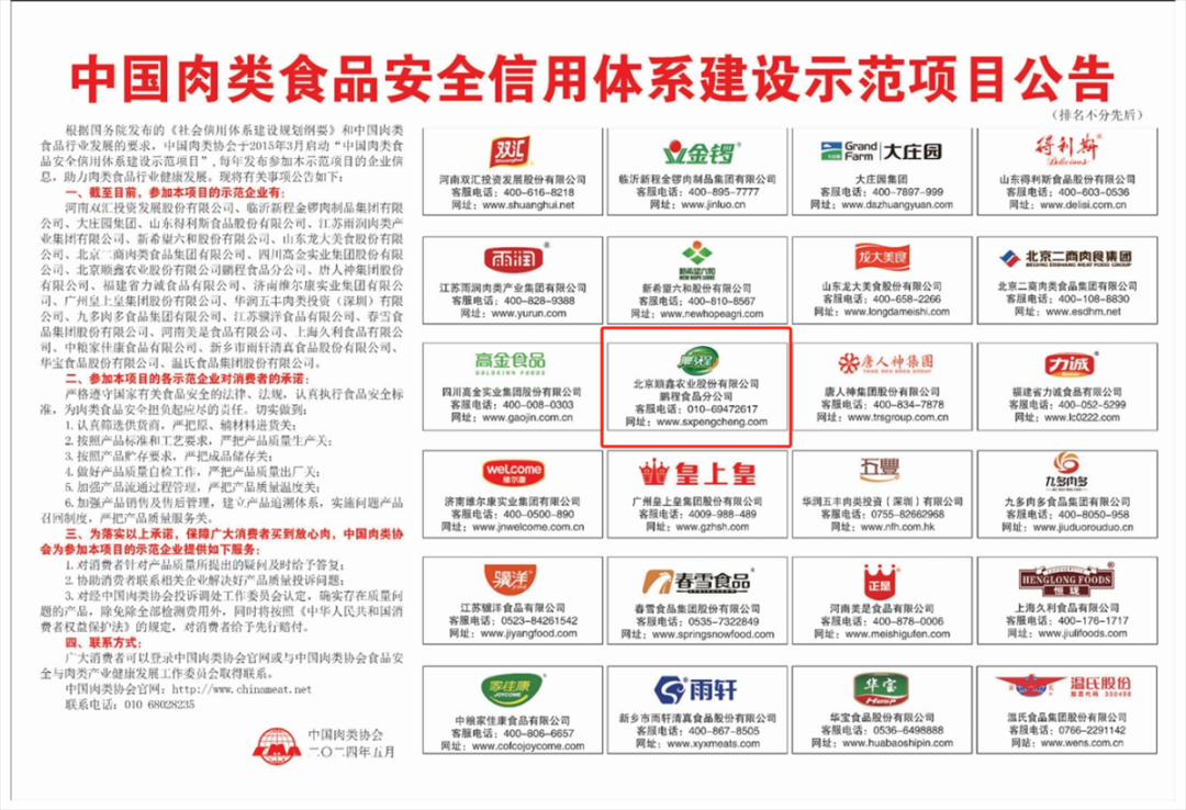 顺义区融媒体中心消息 2024年度“中国肉类食品安全信用体系建设示范项目公告”于近日发布,北京顺鑫农业股份有限公司鹏程食品分公司连续10年入选这一权威榜单,再次彰显其在食品安全领域的卓越表现和诚信经营的坚定承诺。