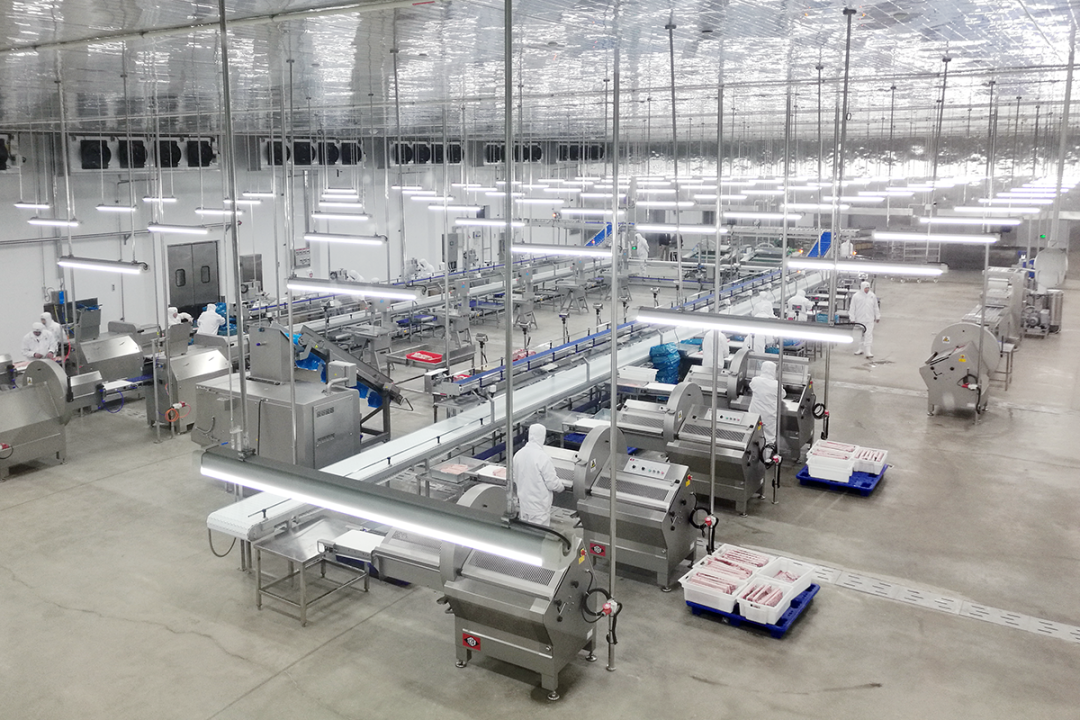 鹏程的屠宰车间引进了国际先进的自动开胸、自动劈半、全自动喷码、同步检验、两步冷却等新工艺新技术,建成了国内先进、达到欧盟标准的自动化生猪屠宰线。生猪进厂前必须经过严格的“产品检疫合格证明”检查,生产加工过程中的原料、产品和环境有11个检测项目进行实验监控。