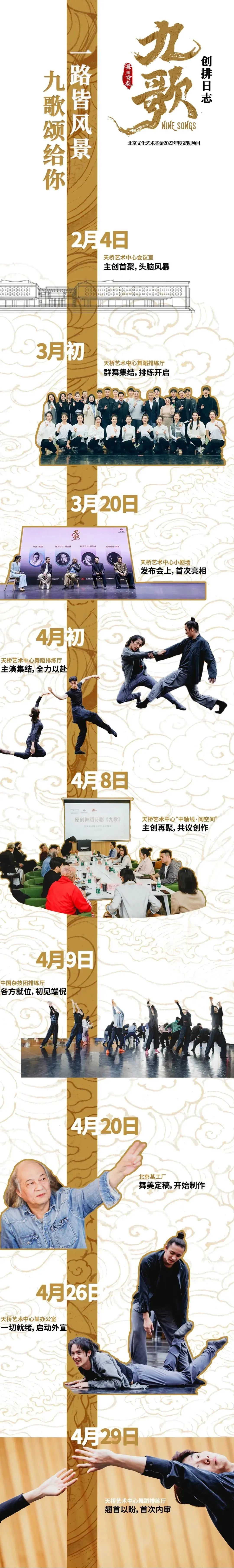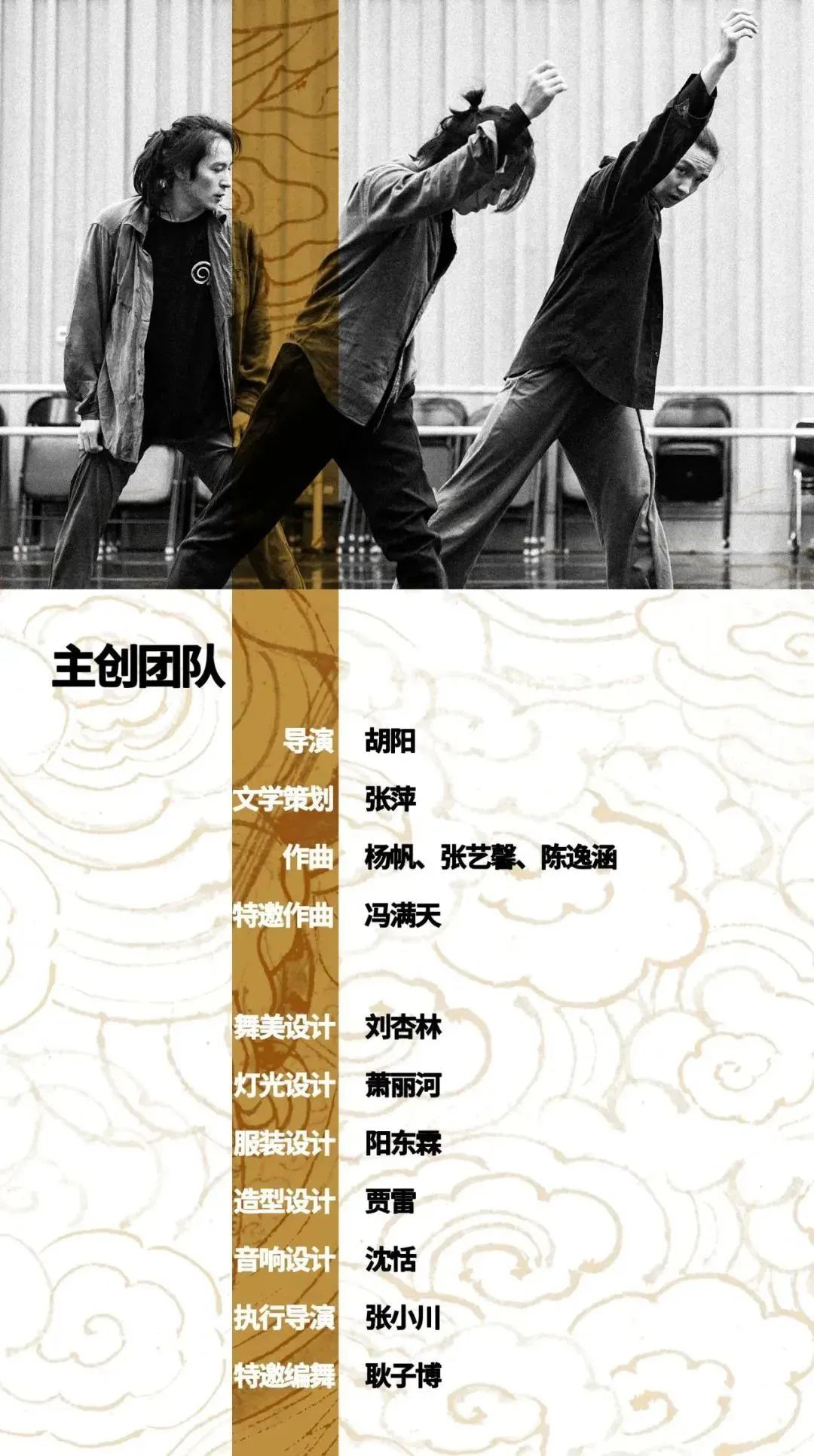 两千多年后,青年舞者胡阳,采撷《九歌》中的瑰丽诗篇,与张萍、杨帆、刘杏林、萧丽河、阳东霖、贾雷、张小川、耿子博等知名主创共施才华,创作了同名舞蹈诗剧《九歌》。由北京天桥艺术中心出品,中演院线、北京歌剧舞剧院、北京云上天幕文化联合出品,共绘华夏文明,将诸神复位,启万象之新。